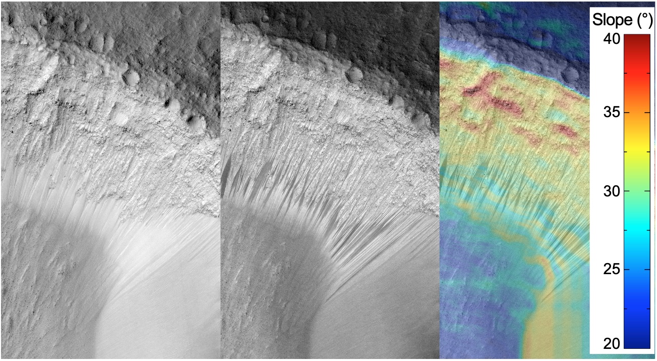 Evolution of RSL at Garni Crater, Valles Marineris, Mars. Left: ESP_029213_1685 at Southern spring (Ls =191.5◦(). Middle: ESP_031059_1685 at Southern spring summer Ls =280.8◦. Right: slope angle map using a stereoscopic digital terrain model. Image MRO, HiRISE, NASA/JPL/University of Arizona